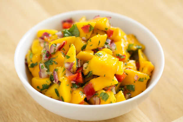 me encanta esta ensalada. He disfrutado de salsa de mango con pescado y pollo, pitas y tortilla chips, maridaje con cuscús israelí (perla) para una ensalada solo hace un maravilloso plato, una comida de almuerzo o una satisfacción de bocado, mañana o
