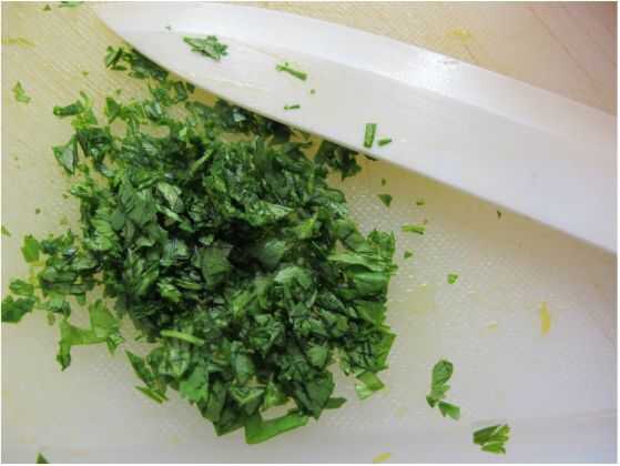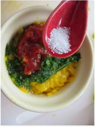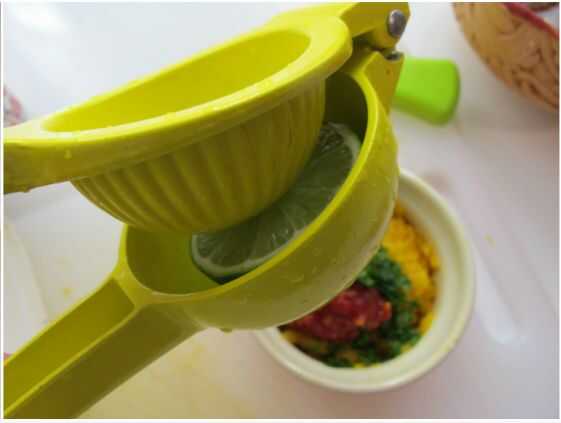 Picar el cilantro hojas en piezas finas así y ponga en el bol con la pulpa de mango. Apriete en el zumo de limón, agregar la pasta de chiles (o Chilis frescos), y luego sal partiendo de su propia preferencia así como la salinidad de la pasta de chiles que usas.