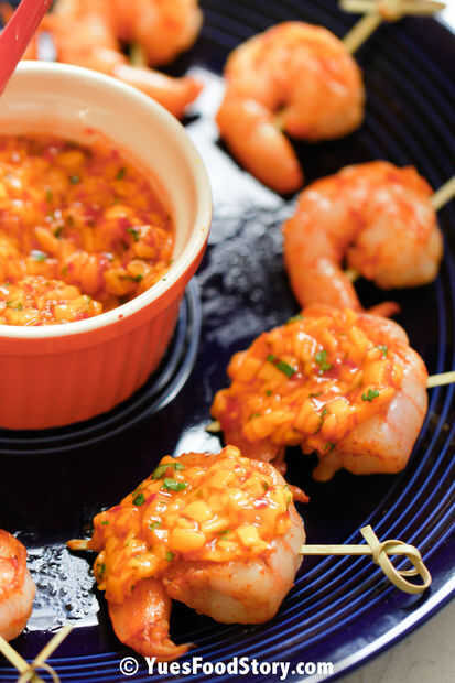 Añadir la salsa de mango picante en los camarones, es una perfecta merienda o aperitivo. El proceso de cocción no es complicado, pero el sabor es increíble como parece. Muy moderno y exótico con algunas influencias tailandesas, también puede ser un plato muy fresco en una cena para sorprender a tus invitados.