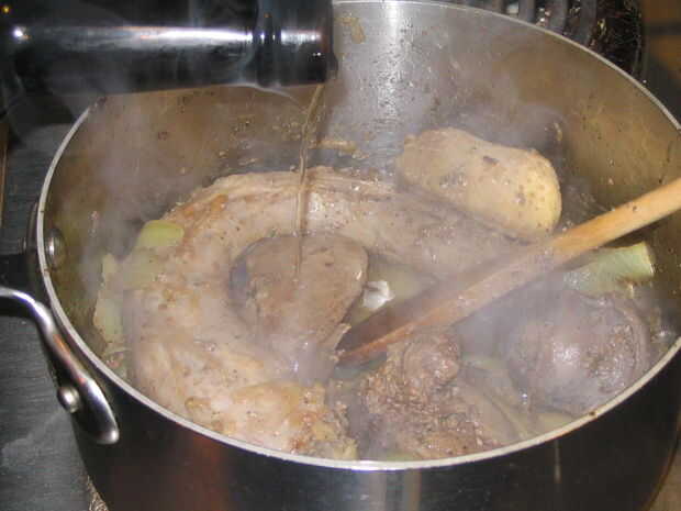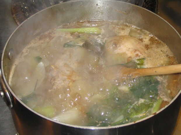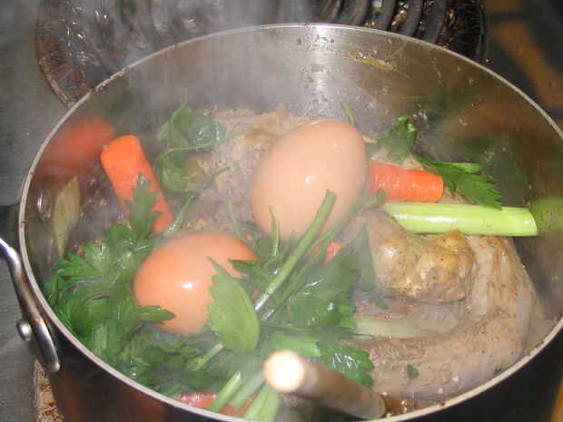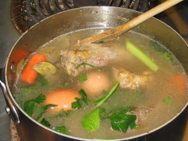 Cocinar a fuego lento y revolver para quitar cualquier crujiente en la parte inferior, luego añadir 2 huevos, verduras y agua para cubrir. Cocer a fuego lento un rato, reponiendo el líquido si es necesario. Los huevos serán completamente enfriarlos durante el proceso.