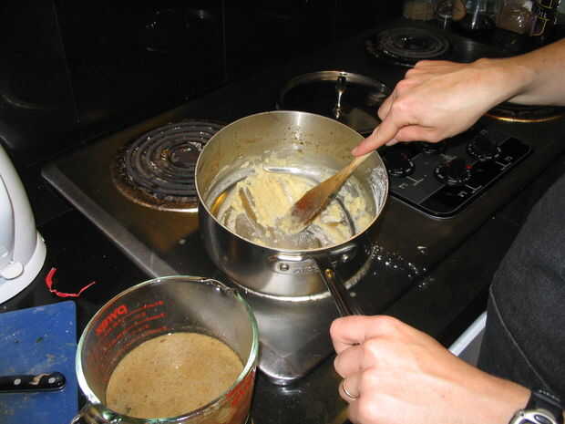 Agregar un par de cucharadas de harina y revolver. Añadir más grasa si necesita - usted quiere que sea una mezcla suave de porridgy. Continuar revolviendo para cocinar la harina; el roux se apagará como la harina de la cocina. Proceder al paso siguiente cuando alcance un color que te gusta, o cuando estés cansado de la agitación.