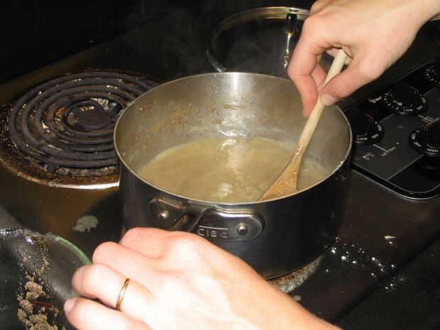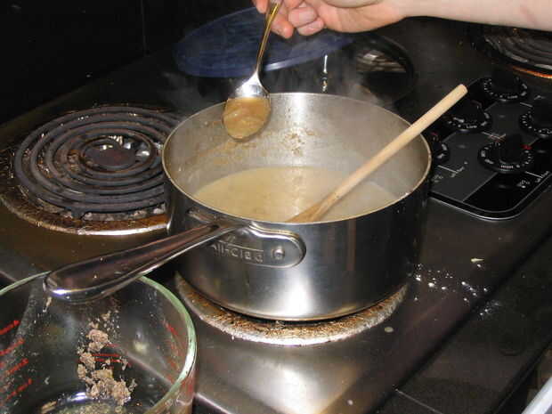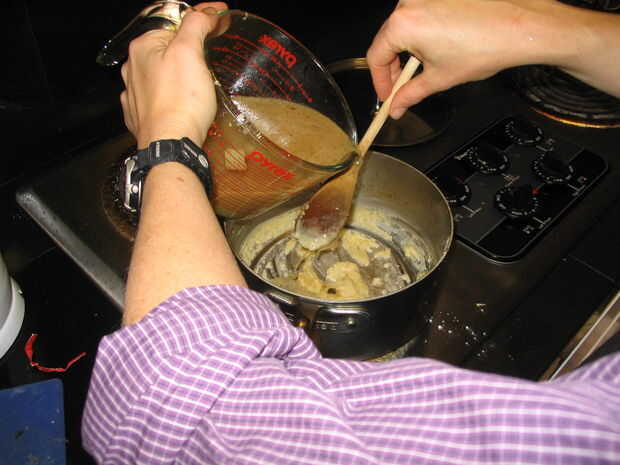Añadir el jugo adicional de Turquía (después quitando la grasa) y el reservado picados menudos y tal. Remover todo un poco dejar que todo se mezclan correctamente.
