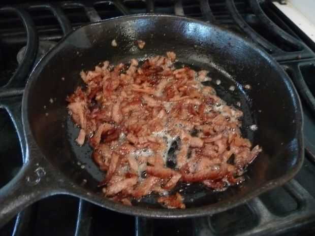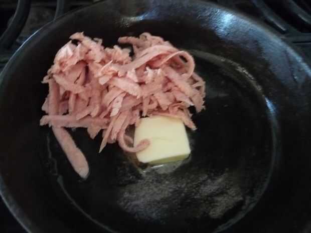 Coloque 1 cucharada de mantequilla en la sartén sobre fuego medio. Añadir el jamón rallado y freír hasta que estén doradas y ligeramente crujiente. Usando un tenedor o cuchara ranurada, retire el jamón niblets a un bol.