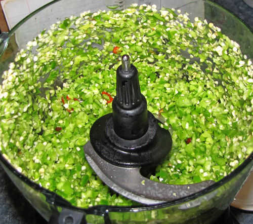 Tomar aproximadamente 2-3 tazas de tus pimientos favoritos (semillas y todo) y en un procesador de alimentos, pulso hasta que quede una buena mezcla uniformemente gruesa, picante.