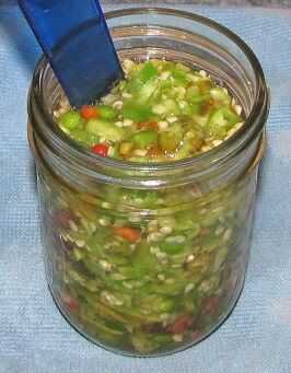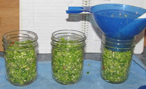 Ahora que los pimientos son procesados (o picados) y las tapas de tarros está preparadas, es momento de llenarlos.