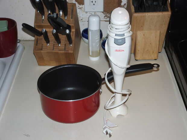 Un mezclador del tubo para mezclar y triturar los ingredientes juntos y una olla para cocinar en.