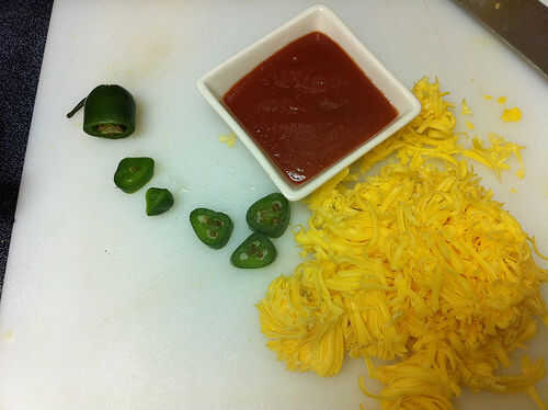Más latas de queso nacho salsa lista tomate puré y Jalapeño jugo como ingredientes. Me parece que son realmente necesarios para ese sabor a "queso de nacho". He añadido un pimiento jalapeño en rodajas y un par cucharadas de puré de tomate.