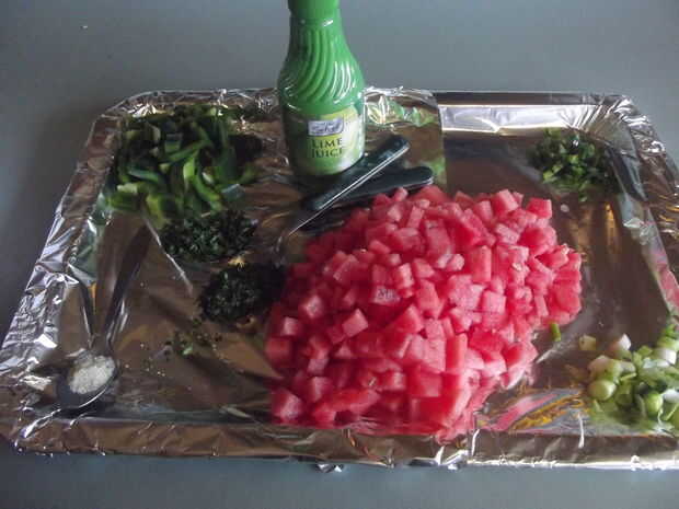 Esta salsa es tan ligero y fácil de hacer. Va bien con un montón de alimentos veraniegos, pero es genial con solo chips!Paso 1: ingredientessandía de 2 c. libre de semillas, en cubos2 cucharadas picada cebollachile de Portilla finamente picado 3 cdas