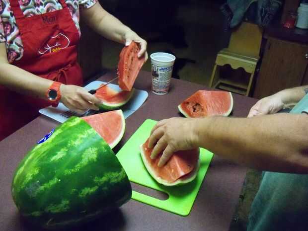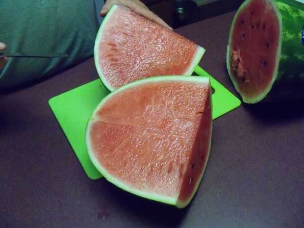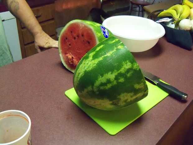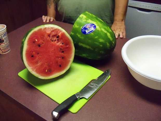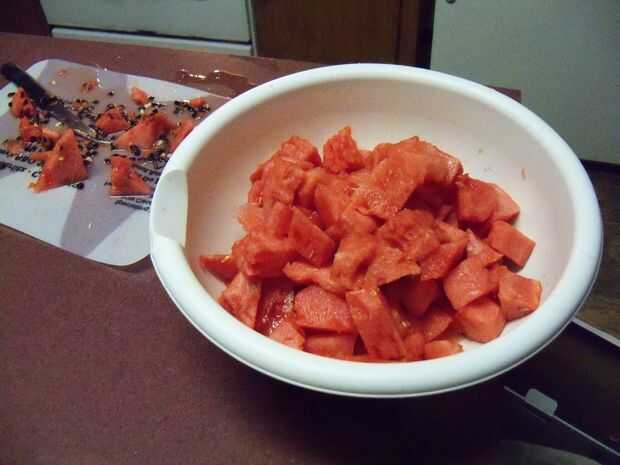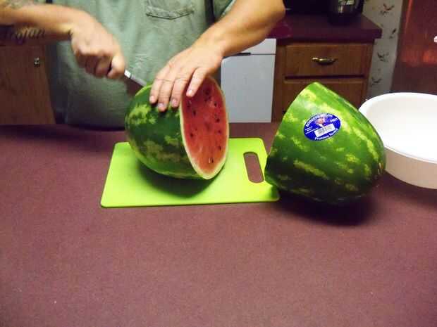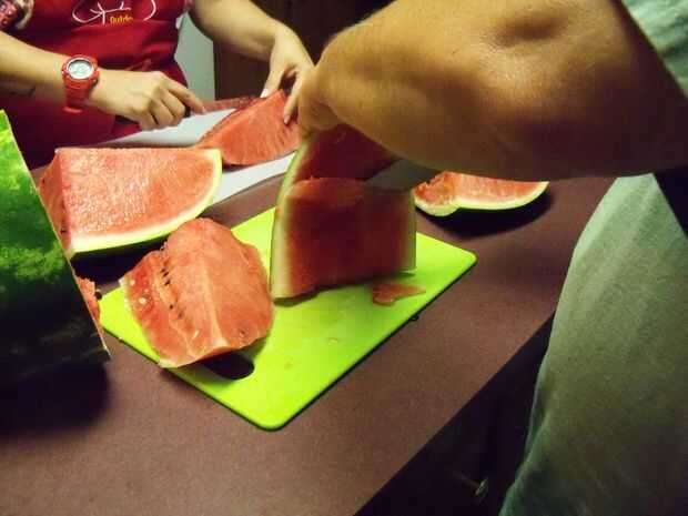 Empezar por cortar la sandía en cuartos, o de que en realidad cualquier tamaño manejable; un truco aseado es que si usted corta hacia abajo de la costura, usted puede cortar alrededor de las semillas (sólo un lujo truco). Después de trocear el melón, seguir adelante y procéselo todo pero la corteza y las semillas fuera de él. Colocar en un recipiente grande que se puede utilizar para la mezcla más tarde.