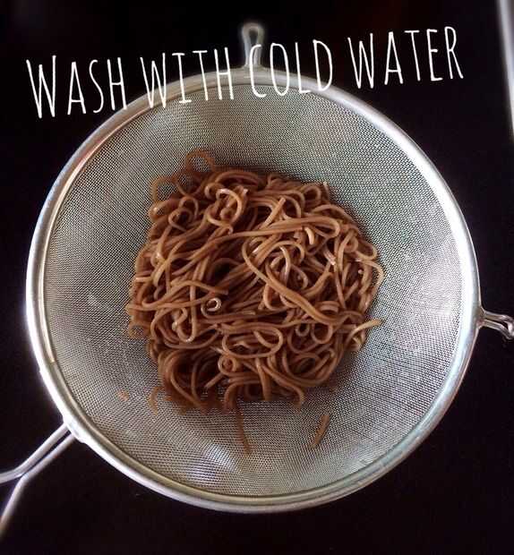 Hervir el agua y cocinar tallarines sobre 5-7 minutos. (Recomiendo para seguir las instrucciones en la caja o bolsa) Cocinar es similar con espaguetis, pero la única diferencia es que tienes que lavar fideos justo después de que cocinado. Hace fideos ser masticable y mejor textura. Lave los fideos cocidos con agua fría. Ponerlos en el colador.