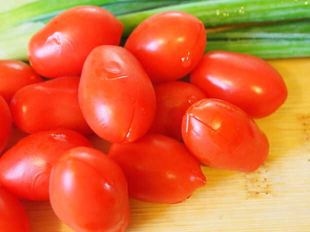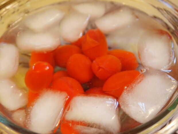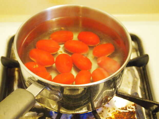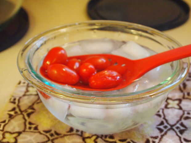 En primer lugar, sacar a un bol de tamaño mediano y llenarlo con agua fría y agregue hielo. Luego, en una cacerola pequeña, poner unas cuantas tazas de agua a hervir. Como que se calienta, debe sacar la pinta de tomates. Con un cuchillo, marcar los extremos de los tomates (enfrente del lado de la madre) con una rebanada o una cruz de dos rebanadas.