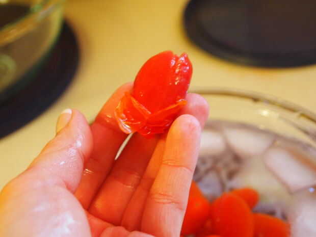 Una vez que el agua este hirviendo, coloque una buena cantidad de los tomates en el agua. Sólo necesitará tenerlos allí por unos minutos, luego retire y coloque en el baño de hielo. Desde allí a sacar cada uno y sacar la piel. Debe deslizarse fuera muy fácilmente. Una vez que se hace usted quedará con una escudilla llena de tomates sin piel.