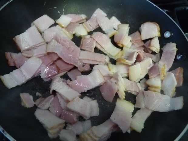 Utilice tijeras para cortar el tocino en trozos pequeños. Espolvorear con una pizca de hojuelas de pimienta y freír en una cacerola mediana a fuego medio hasta que es curruscante. Escurrir sobre una toalla de papel y de la palmadita apagado el exceso de grasa.