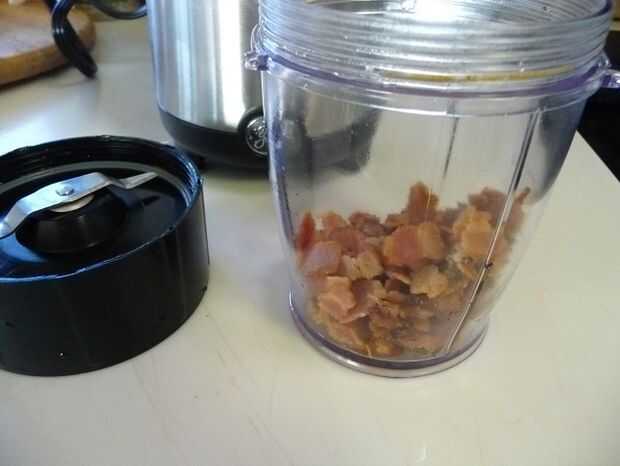 Mientras se derrite la mantequilla, poner las piezas de tocino en una bala, licuadora o procesador de alimentos. Wiz-bang el tocino durante unos 10-20 segundos hasta que finamente molido como muestra la imagen.