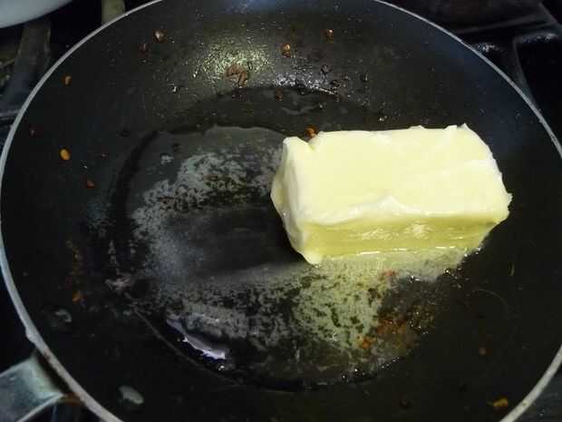 Use otra toalla de papel para limpiar hacia fuera la bandeja, quitar la mayor parte de la grasa de tocino. Añadir la mantequilla y deje que se derrita lentamente.