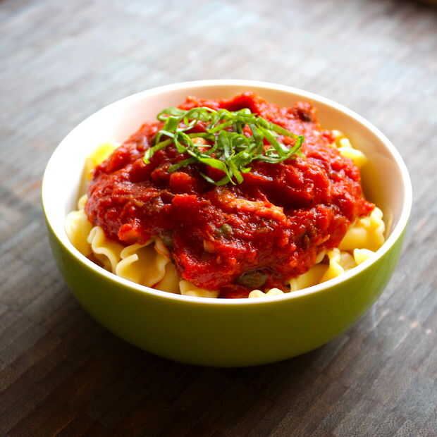 Me encanta el sabor salobre de aceitunas y alcaparras, y van perfectamente con la dulce espiga de los tomates. Mientras que he mantenido que esta salsa bastante simple, puede añadir vino tinto, pimientos verdes o zanahorias, o incluso carne de res para aumentar el sabor y hacerlo más relleno de tierra.
