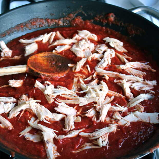 Si usted está añadiendo en las sobras, ahora es el momento para hacerlo. El pollo deshebrado y revuelto en.