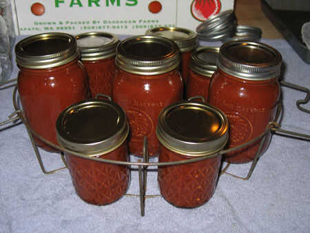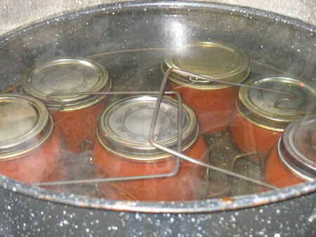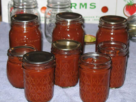 Procesar los frascos de ketchup en un baño de agua caliente durante unos 15 minutos (traiga a un hervor y hervir durante 15 minutos). Asegúrese de que el agua cubra sus frascos por lo menos 1/2 pulgada.