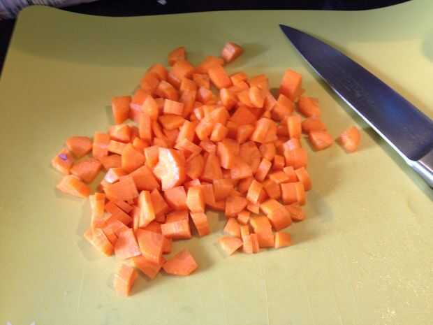 Picar las zanahorias, añadir a la sartén, remover otro.