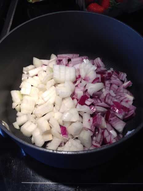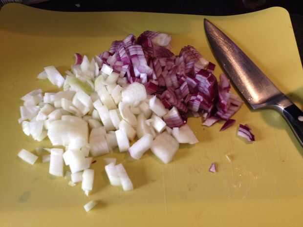 Picar las cebollas. Verás en la foto que usé cebolla marrón y rojo, no hay razón particular para esto, que es justo lo que estaba en el armario.