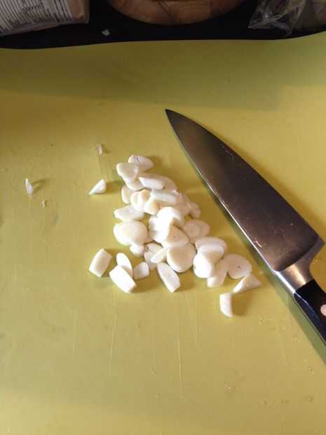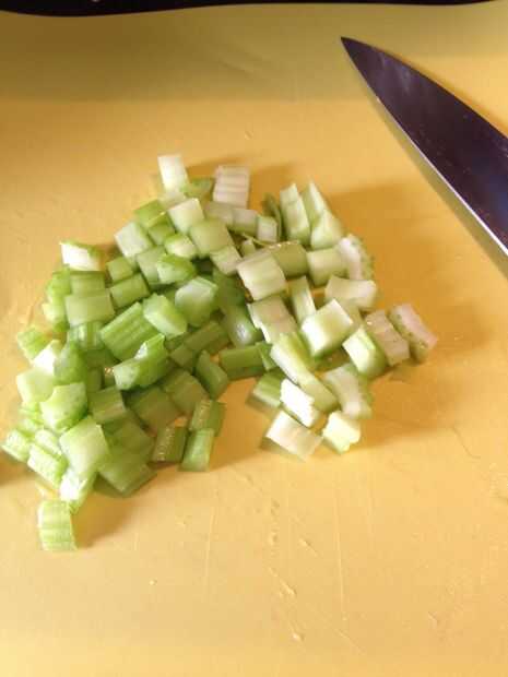 Picar el apio y el ajo, añadir a la sartén y remover un par de veces hasta que todo esté bien mezclado.