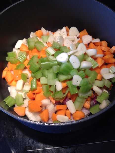 Caliente el aceite de oliva en una olla grande, solo a fuego medio-bajo está muy bien.