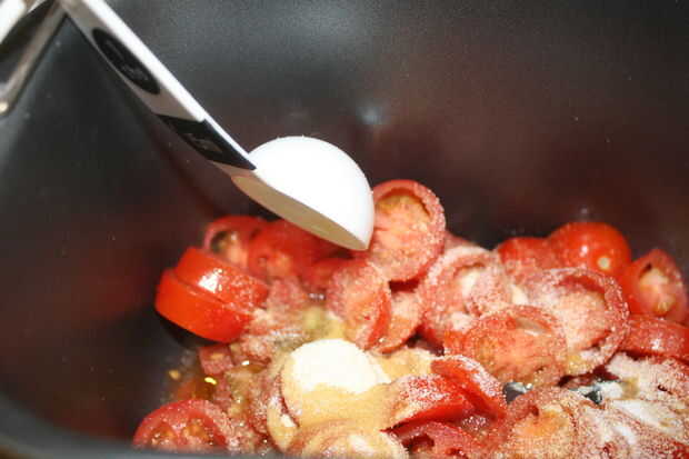 La desventaja de usar una máquina de pan no programable es que usted no tiene control sobre el ciclo de agitación o la temperatura. Esta máquina utiliza un golpe bastante vigoroso para revolver la salsa, porque espera estar luchando una mezcla de mermelada espesada de azúcar. La salsa de tomate es mucho más fina, especialmente al principio, y las hojas tienen una tendencia a tirar cosas altas contra las paredes.
