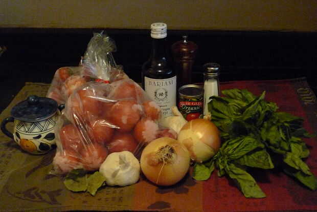 Se necesita: una olla grande, dos bolsas de producto ordinario de tomates congelados, pasta de tomate, aceite de oliva, albahaca fresca y orégano, dos cebollas amarillas, hojas de laurel, una cabeza de ajo, sal y azúcar (pimienta en cuadro de encendido superior más adelante si lo desea).