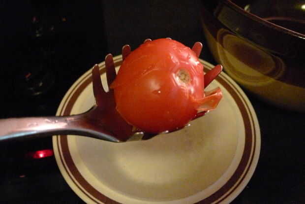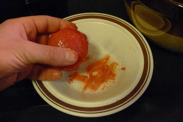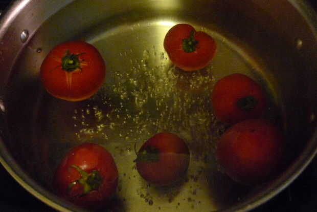 Cuidadosamente deje caer unos tomates en el agua hirviendo.  Sólo necesitan estar allí para cinco o diez segundos antes de que las pieles split y se pueden quitar.  Las pieles deben Despega fácilmente.  Puede agregar otra placa al proceso de los tomates como eliminarlos del agua.  Por favor trate de no quemarse tanto como yo.