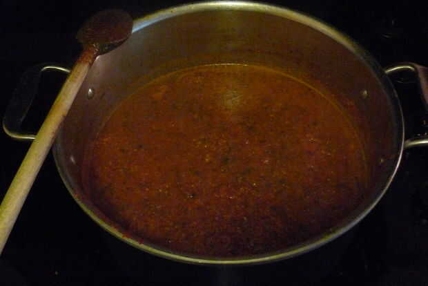 Baje el calor y agregar la pasta de tomate y la hoja de laurel (lo puse en dos). También agregar un poco de azúcar y la cantidad de sal que te gusta. Generalmente espero a añadir gran parte de la sal hasta su terminado, así que puedo probarlo. Dejar cocer a fuego lento en baja por aproximadamente una hora. Revuelva con frecuencia. Cuando el agua deja la agrupación en el la parte superior (segunda foto), su hecho.