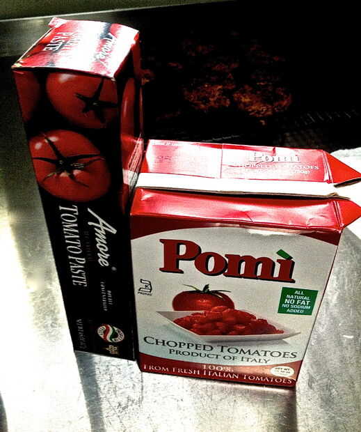 1 bote de tomates Pomi picado... Utilizo los tomates paquete suave porque el ácido de los tomates se ha demostrado que desglose el revestimiento (capa) del interior de la lata y se sabe que es cancerígeno...
