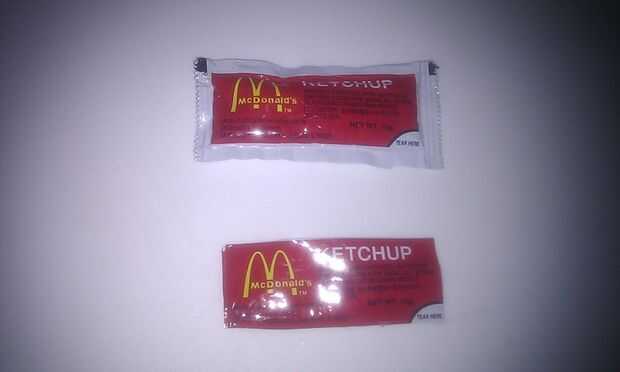1) corte abra un paquete de salsa de tomate. Use la salsa de tomate sobre sus chips (no lo desperdicies!). Corte la parte coloreada en el borde. El borde ayuda a ocultar las costuras. Limpie el interior de la cubierta.