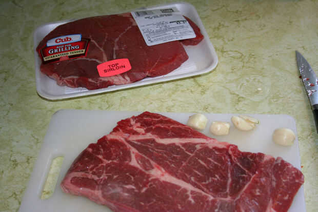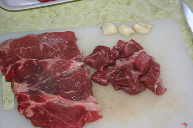 Este es un procedimiento bastante sencillo. En primer lugar, Picamos los filetes en cubos de medio o cuarto de pulgada. Puede quitar parte de la grasa si quieres, pero no cortar todo de él hacia fuera! Esa grasa será necesaria extraer los deliciosos sabores de la cebolla y el ajo durante la cocción.