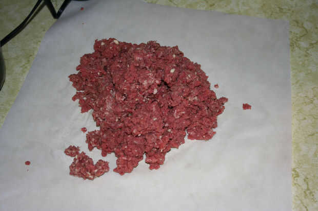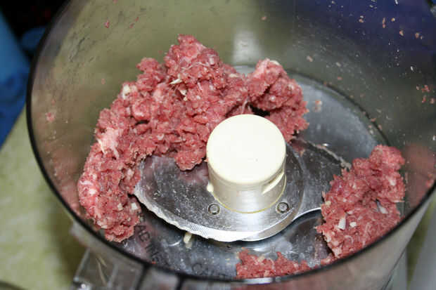 Desde aquí tienes dos carnes diferentes, use sus manos para mezclar todo una vez que hayas terminado pulido. Aparte de asegurarse de que se integren las dos carnes diferentes, esto también le permitirá sentir si hay trozos grandes de carne o grasa que perder el procesador. Si encuentra alguno, puede cortarlas más finas o arrójelos a la basura.