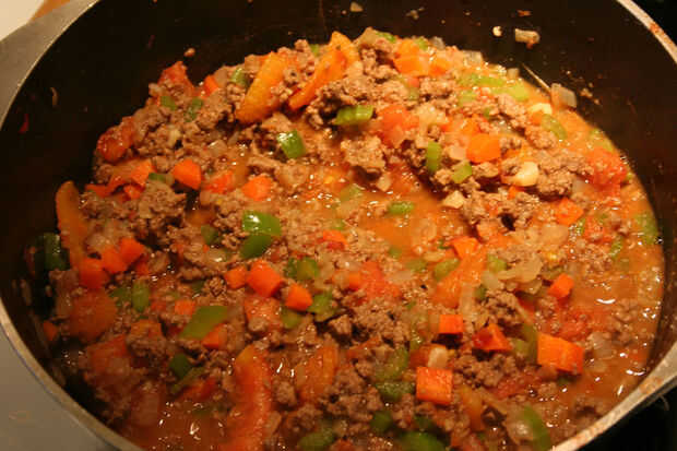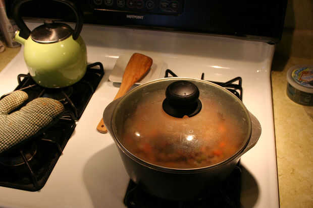 Sé que ahora mismo parece un lío caldoso, pero una vez que funciona vino es mágico cosas diferentes. En este punto, paso el calor a medio-bajo. Básicamente, estoy tratando de obtener el calor tan bajo como sea posible mientras que todavía permite el líquido a fuego lento. Cubrir parcialmente el bote para asegurarse de que el vapor pueda escapar, pero también eso él escapa lentamente. Revuelva cada pocos minutos para asegurarse de que no se está quemando en la parte inferior...