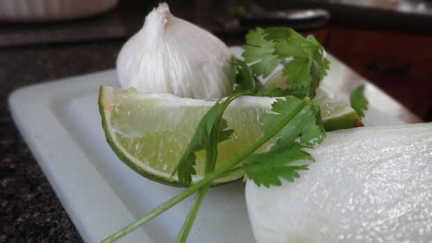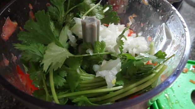En los procesadores de alimentos, picar la cebolla con el ajo. Separada en dos porciones.