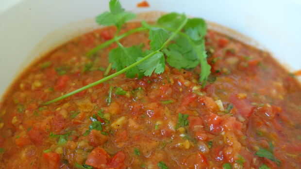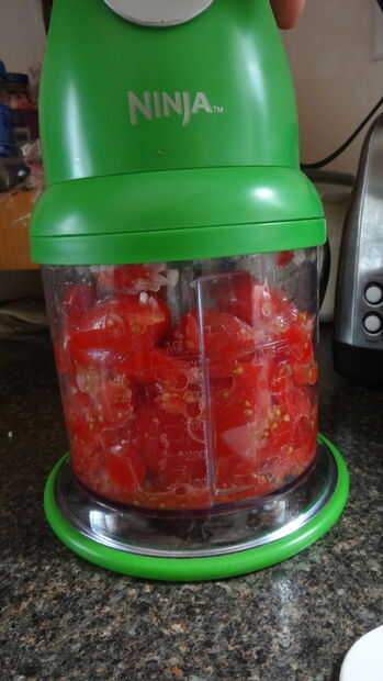 Hacia el procesador de alimentos. Añada la última pinta de tomates, el cilantro y la otra mitad de la mezcla de cebolla/ajo. Puré de todo.
