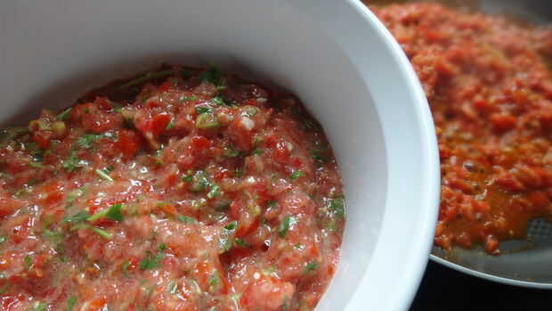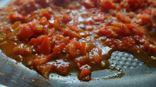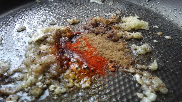 Acitronar la cebolla, ajo y especias para 3-4 minutos. Añadir los tomates picados. Cocer durante unos 6 minutos más.