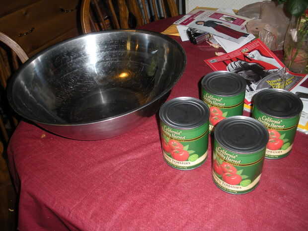 Vaciar todas las latas de tomate en el vaso muy grande. Mayoría de los tipos de tomate conservada llano trabajará con un poco de esfuerzo. También pueden utilizar tomates frescos. He encontrado que tomates triturados en puré de tomate es fácil de usar, ya que es ya las trozos de tamaño adecuados en la salsa de la consistencia adecuada.
