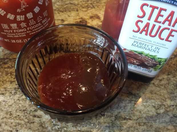 Lo que tenia en mano en el momento era una Tarrina de salsa BBQ que obtuve de un restaurante de comida rápida. Cualquiera va a hacer. Creo que la cantidad es aproximadamente 1 onza de líquido. Apriete en el bol para mezclar y agregar 1/2 tanta salsa para bistec (por volumen). Añadir una cantidad de salsa de tomate igual a la cantidad de salsa para bistec.