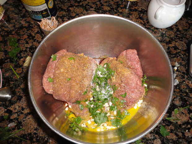 Albóndigas de toman alrededor de media hora para preparar, la mayoría de los cuales es picar y picar con una pequeña cantidad de la mezcla. Pele primero trocear el ajo con un cuchillo de cocina. El perejil italiano es el siguiente, limpie y luego groseramente picar las tapas, luego deseche los tallos. Poner la carne molida en el bol grande; Añadir el perejil, ajo, sal y pimienta, una mano llena de queso y los huevos. Mezclar los ingredientes con las manos, agregar las migas de pan como sea necesario hasta que usted puede tomar un pequeño puñado de carne y caer con él sólo se pegue ligeramente a mano. Rollo de la carne en bolas sobre mitad del tamaño de tu puño.
