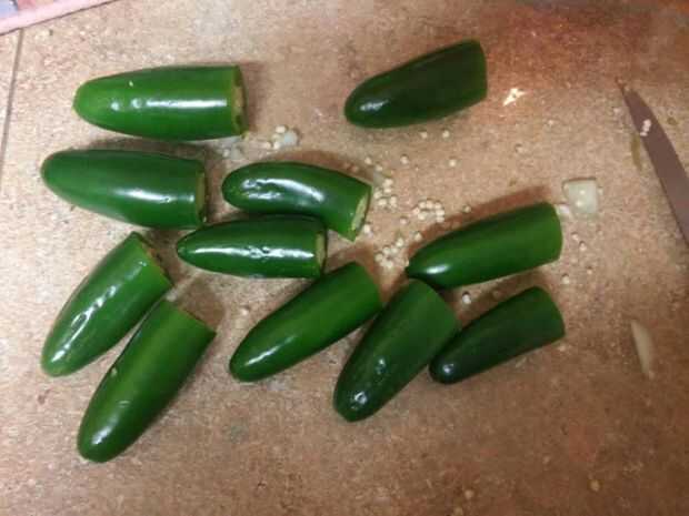 Cortar las tapas de sus Jalapeños. Luego cortar en trozos lo suficientemente pequeños como para caber en un procesador de alimentos. Asegúrese de que incluye las semillas, esto es lo que le da calor! Dados algunos ajos tiernos y cebolla y poner en el procesador, así. No incluir exactamente cuánto ajo a utilizar, ya que lo basa en su gusto personal. Usé 3 cucharadas de la misma, personalmente. sí, jamás podría ser un vampiro. Encienda su procesador de alimentos hasta que todo esté picado pero no tan pequeño donde parece que se están mezclando.