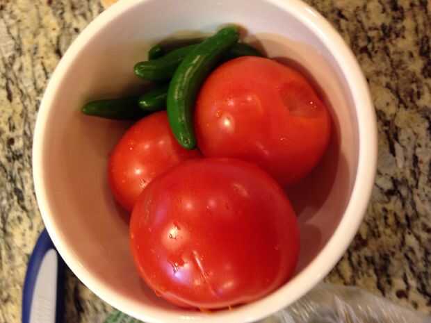 Añadir los tomates y los chiles serranos en un tazón profundo microondas. Cubra el tazón con envoltura Saran.