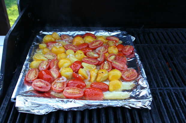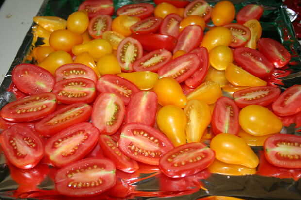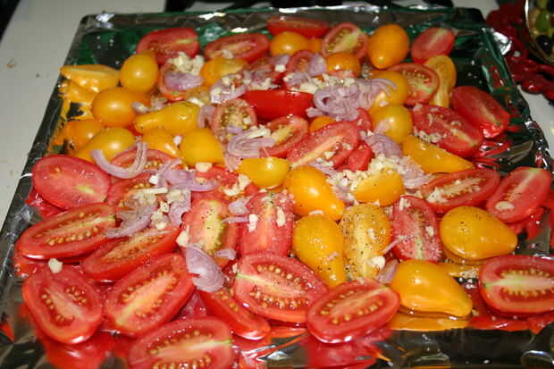 Poner todos los tomates fuera de su bandeja y cargan con picada de ajo, finamente rebanados chalotes, sal, pimienta y un montón de aceite de oliva. (Agárrate las hierbas, por ahora) Lo mezcle todo con las manos por lo que todo está bastante uniformemente cubierta.