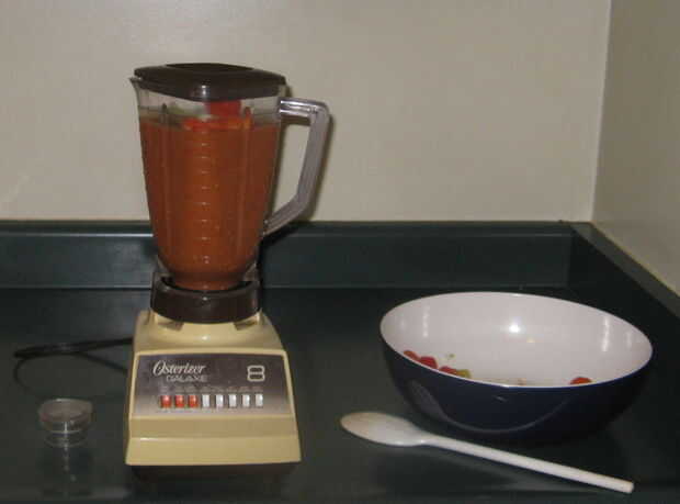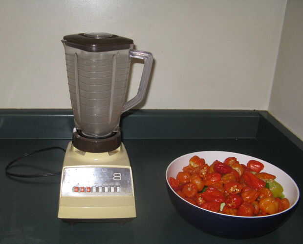Una vez que los tomates son licuados agregar los pimientos, cebollas y ajo a la licuadora poco a poco hasta que todos los ingredientes son un líquido espeso, esto debería hacer que un litro de salsa.