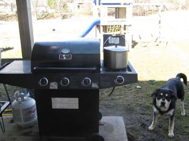 No importa Jake siempre viene sobre cuando usar la barbacoa saltando caerá algo de carne; no ayuda a disuadirlo ya que le doy sobras.