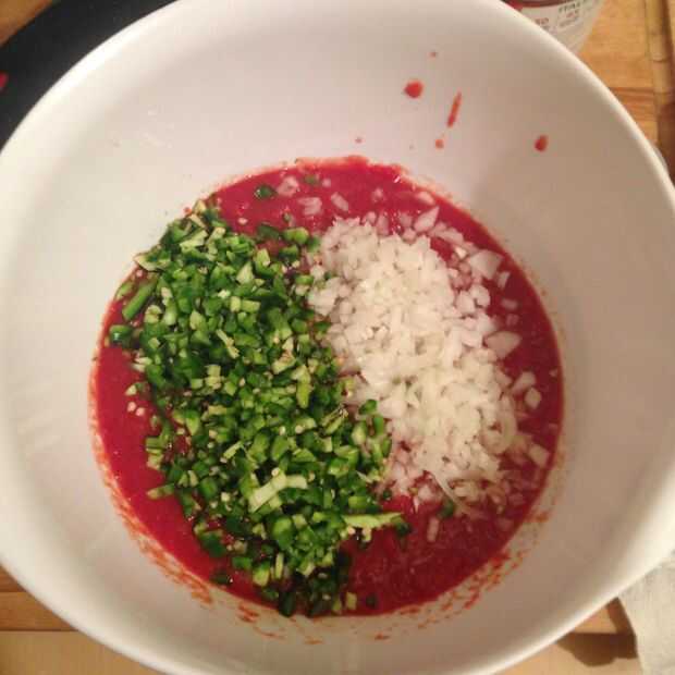 Este es un proceso fácil. Tu simplemente vas poner el tomate triturado en el recipiente grande. Tiro una vez que lo hecho en la cebolla y jalapeños en la parte superior. Es importante que el recipiente que utilice sea grande, para que tengas espacio para mezclar.
