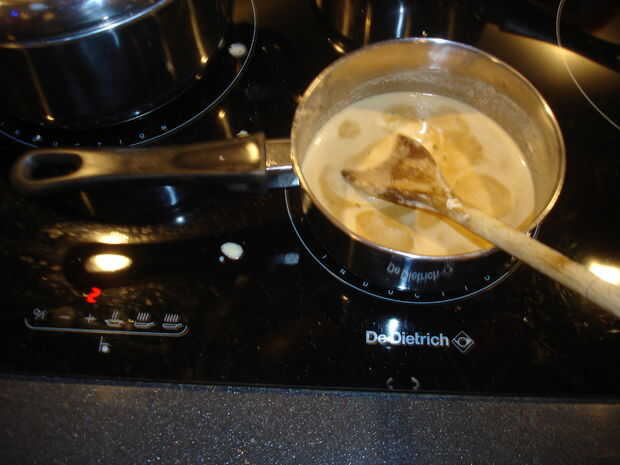 Seguir calentando y revolviendo hasta que esté caliente y todos los ingredientes están bien mezclados en ella debe ser un color beige y generalmente un poco uno el lado más grueso, pero la consistencia depende de usted.