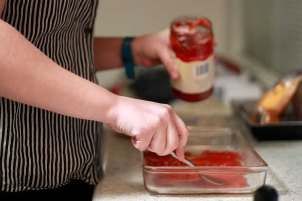 Verter otro tercio de la salsa en el fondo de una bandeja para hornear de 9 x 13.