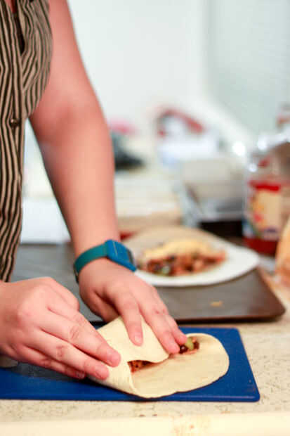 Doble estilo burrito y caber todos seis tortillas al lado del otro en la bandeja.